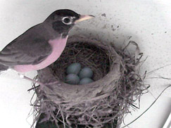 Robins prefer to nest in spruce or maple trees, but are very adaptable, nesting in all sorts of trees and buildings — including my porch light!